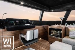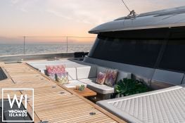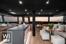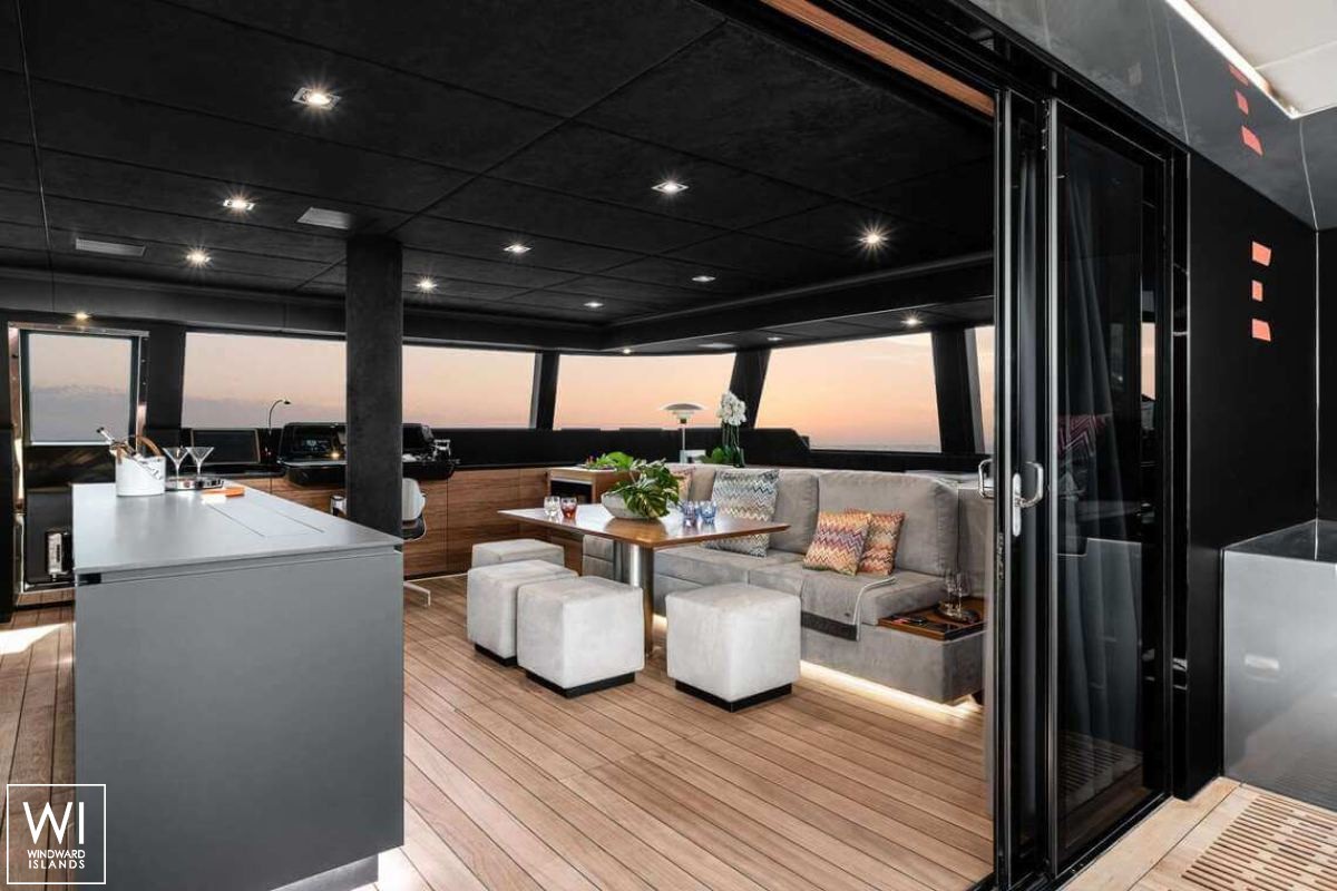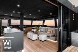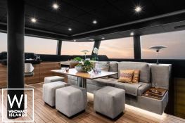 在主甲板的船尾有一个大的露天饮食空间,有一张可以容纳8个人的大桌子,还有一个朝向船尾的沙发,可以用阅读材料和其他消遣方式休息。右舷有一个日光浴床,另一侧有一个烧烤炉/酒吧和通往飞桥的梯子。