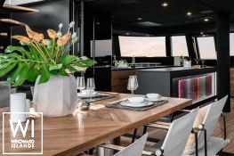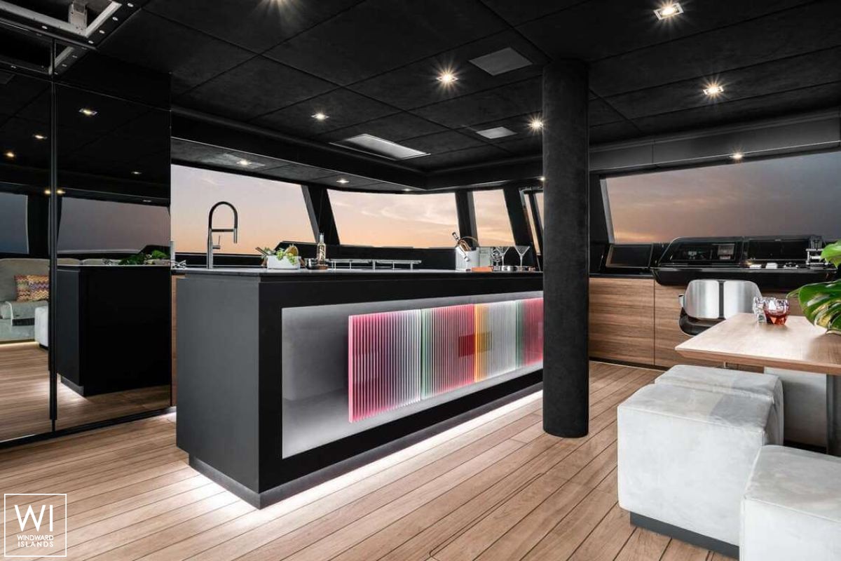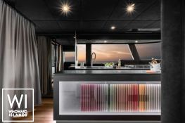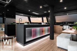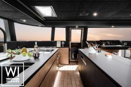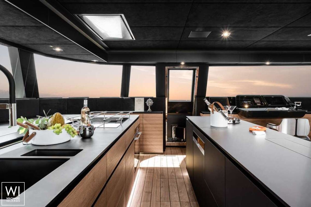 客人和船员的宿舍都在船体上,把厨房、沙龙和舵手控制权留在中心区域。一台宽屏电视隐藏在左舷厨房的一个岛式柜台后面。