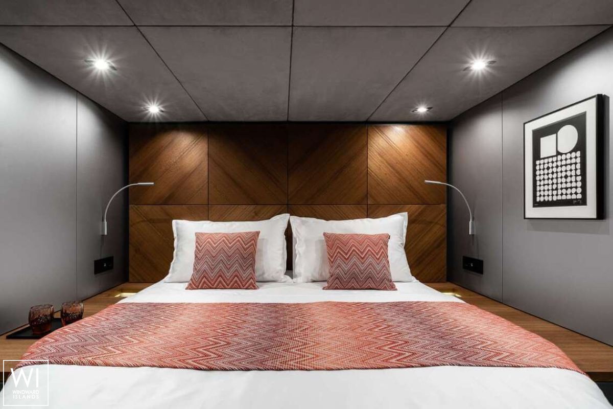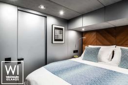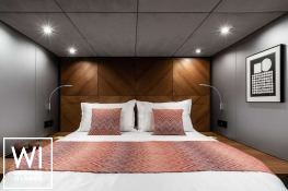 船舱共可容纳8人,有4个套间住宿:一个主人套房和三个双人房。主人房位于左舷船体的中段,设有一张大号床和一间套房,其衣柜和淋浴间与厕所和水槽分开。其中一间双人房位于主卧室的前面,另外两间双人房位于前面和舯部。