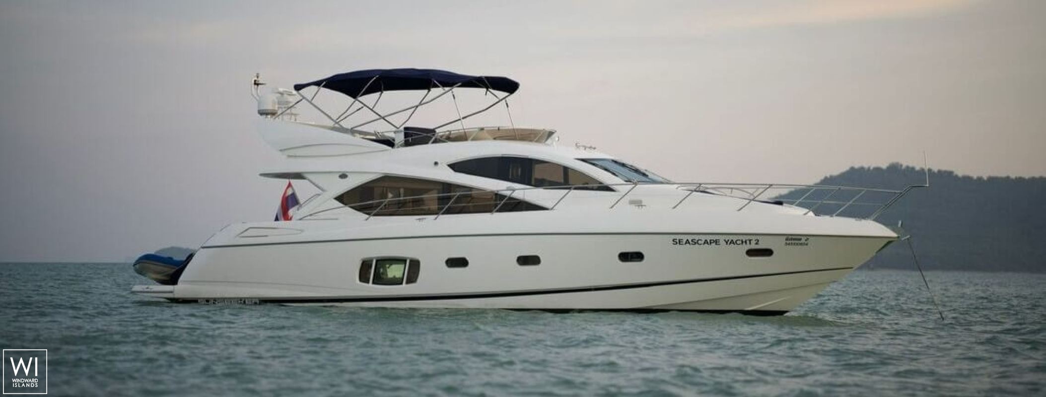 With three well-appointed staterooms, SEA SCAPE 2 can accommodate up to six guests. It is a 3-cabin motor yacht Sunseeker 60, built in 2009 (renovated in 2022), and it is docked at the Royal Phuket Marina in Thailand. The yacht features two double cabins and one double cabin with a bunk bed, and pillows and blankets are included in the price.