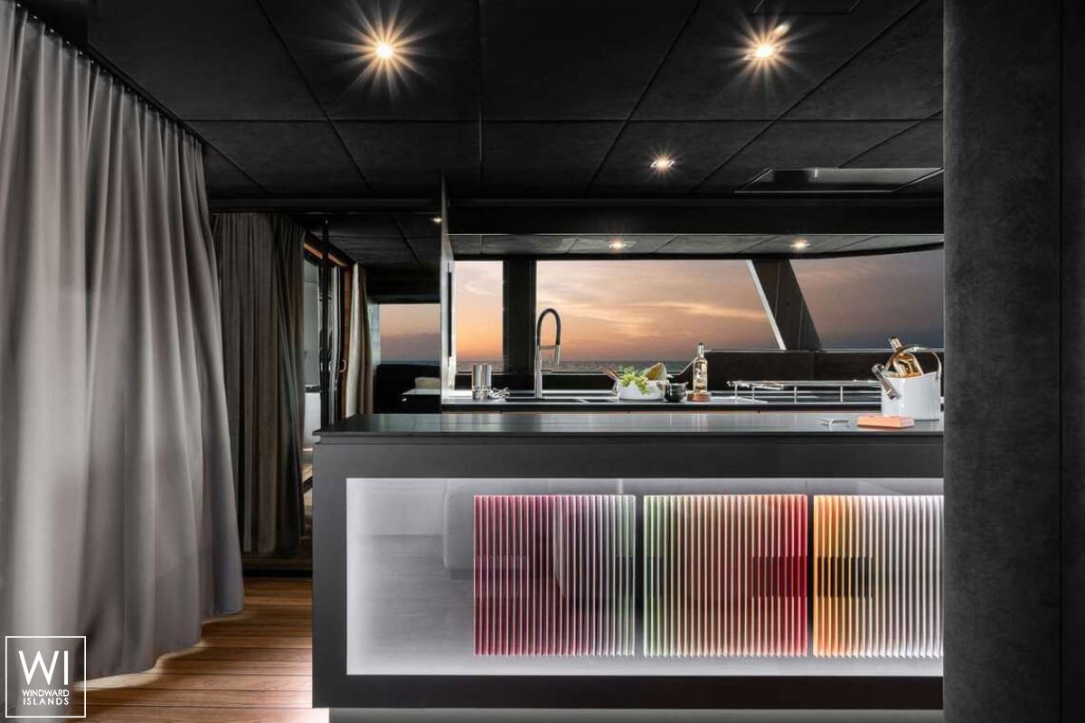 Gli alloggi degli ospiti e dell'equipaggio si trovano negli scafi, lasciando la cucina, il salone e i comandi del timone nella zona centrale. Una TV widescreen è nascosta dietro un bancone a isola nella cambusa sul lato sinistro.
