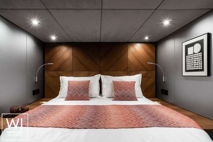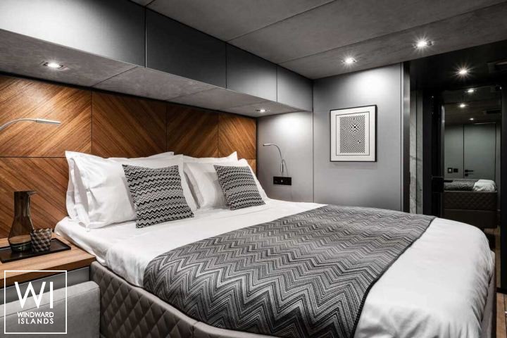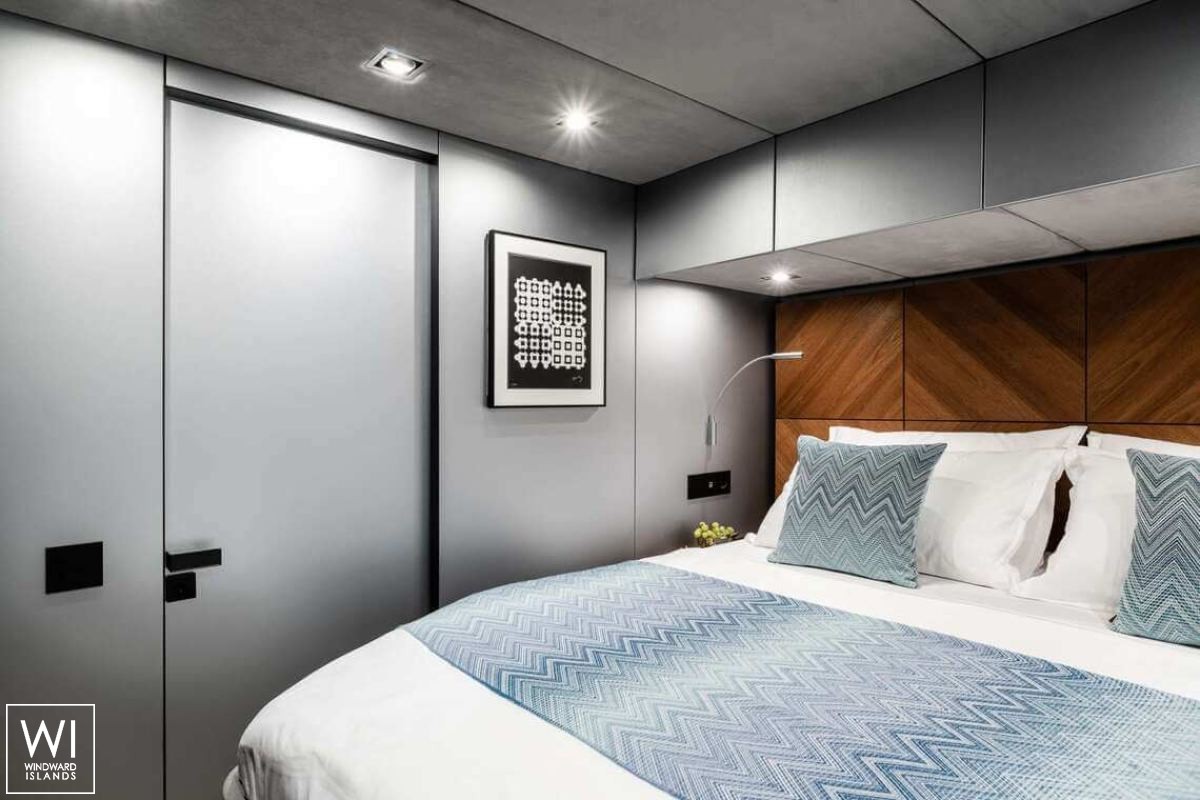Le cabine ospitano un totale di 8 persone in 4 alloggi en-suite: una master suite e tre camere doppie. La cabina armatoriale, situata a centro barca nello scafo di babordo, dispone di un letto matrimoniale e di un bagno in camera con armadio e doccia separati dalla toilette e dal lavandino. Una delle camere da letto doppie è posizionata a prua della camera da letto principale, con le altre due cabine doppie posizionate a prua e a centro nave.